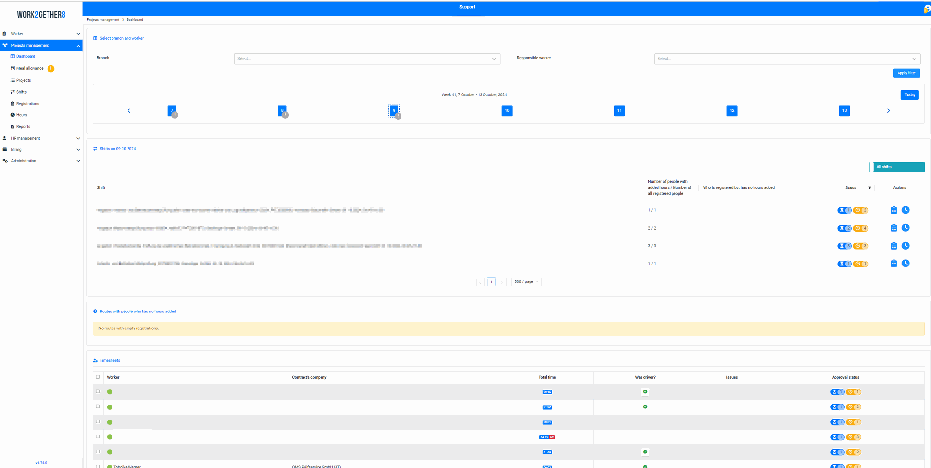 The application accommodates users across different time zones, ensuring that all time-related data (such as shift times, clock-ins, and clock-outs) are accurately recorded and reflected according to the user’s local time. This feature supports global operations and shows to Project Managers if there is a difference between registered and current time zones.